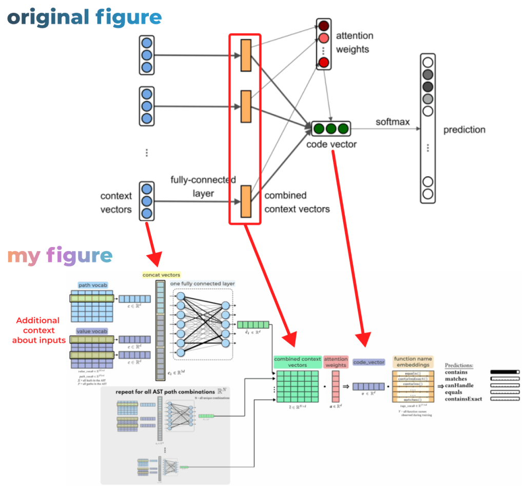 The original paper’s architecture diagram for comparison. I think this diagram has less info and is harder to parse (particularly to double arrows going to the attention weights and code vector, when it’s actually easily expressed in a step-by-step way that’s easier to visually understand.