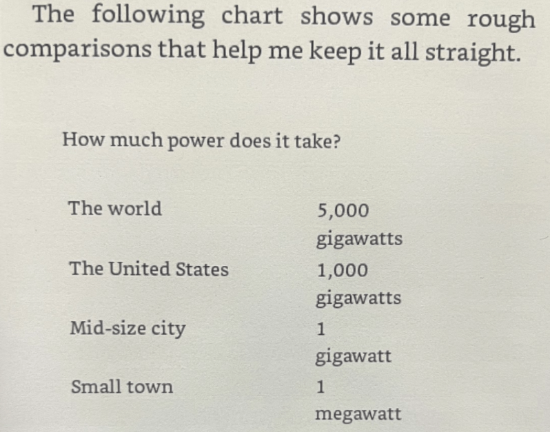- Kilowatt = house. Gigawatt = smaller city. 1000 gigawatt = USA.