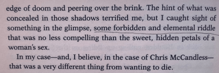 I think he went into the Wilderness in part just to spite his parents and his mission was slightly suicidal because he didn’t care if he lived or died and wanted to prove his parents wrong either way. Actually, after finishing the book I think he was not suicidal, and very careful in his preparation, he just had huge ambition and it actually almost worked! He got unlucky eating those potato seeds that literally nobody really knew were poisonous during only a certain window of the growing season.