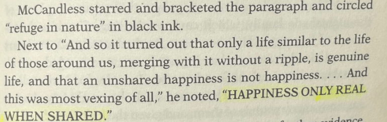 - RE: Sources of happiness; Chris was addiment that it came from mmore than just interpersonal, but then when he was in the bush he started writing “Happiness is only true when shared.” That’s a full about face on the merits of sharing the experience.