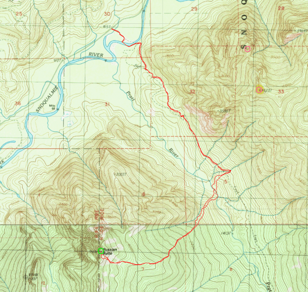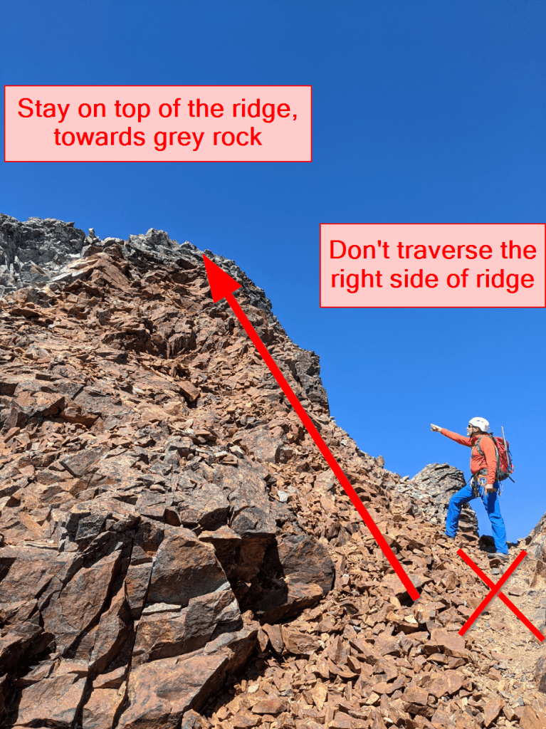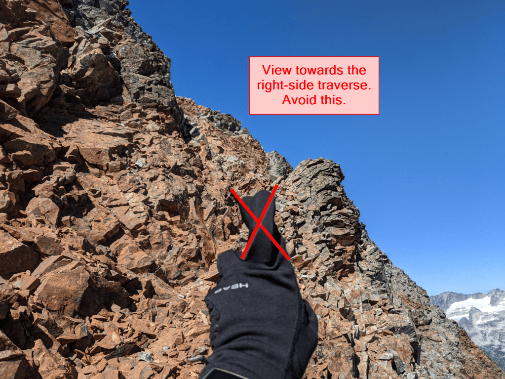 The traverse from Sahale to Boston is best completed STAYING ON TOP OF THE RIDGE. In particular, make sure to take to top line, and DO NOT traverse around the right side as shown below. This point is a little over halfway along the traverse starting at Sahale towards Boston.