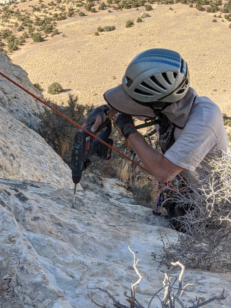 For the descent, we had little choice but to drill (somewhat suspect) bolts into the sandy rock, hence our triple protection.